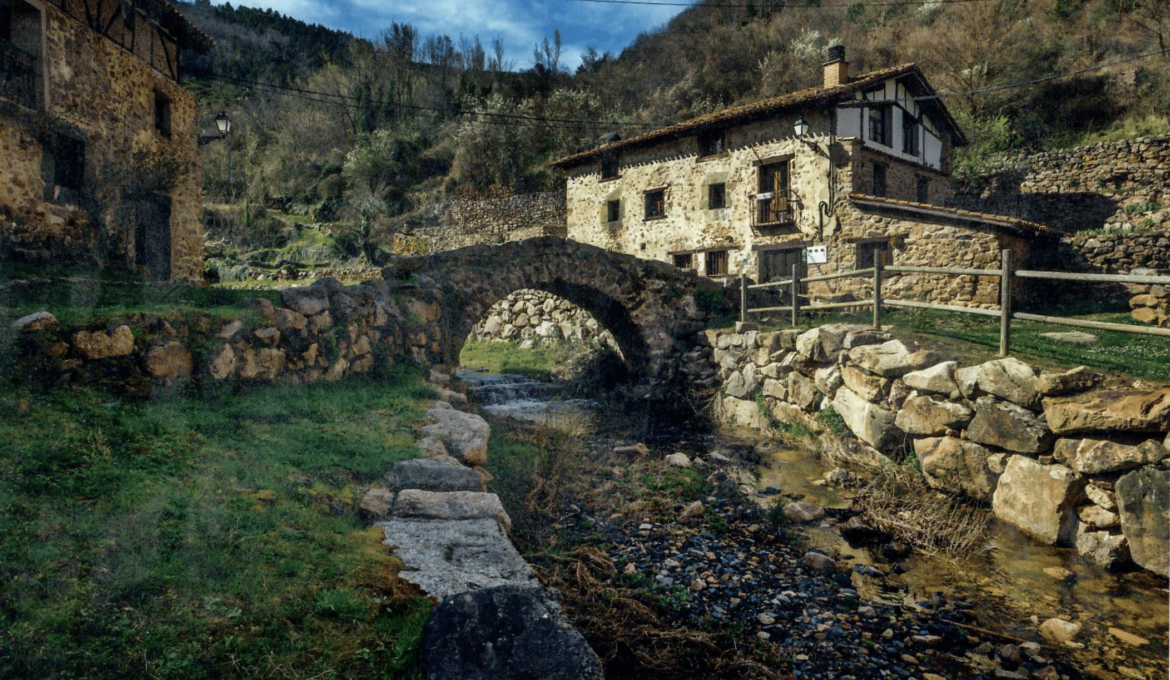 Aldeanueva de Cameros es, sin duda, uno de esos pueblos que deja huella. Parece que en este recóndito lugar del Camero Nuevo se ha parado el tiempo ya que sus calles conservan aún casi de forma imperturbable la esencia de los pueblos serranos, con sus típica arquitectura de piedra, adobe y entramado de madera, los pasadizos o sus callejuelas empedradas y cubiertas del verdín producido por la humedad. Pero una de las visiones más embaucadoras de Aldenaueva de Cameros es la zona del río donde se halla un pequeño puente de piedra que cruza el arroyo y proporciona al visitante una estampa que quedará, seguro, grabada en su memoria. Este arroyo, que presenta en esta época un caudal importante, nace en el término municipal de Lumbreras, cerca del de Laguna, a unos 1.340 metros de altitud, entre el Alto de los Lapazares y Peñas de Alcubilla y desemboca en el río Iregua.