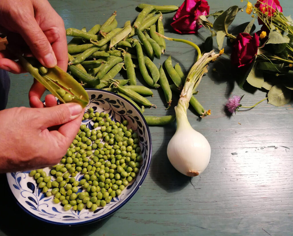 De la huerta se rescatan las espinacas, los imponentes cardos y se sacan de la tierra los puerros guardados en la época de nieve ( los más tiernos y sabrosos), para tomarlos solos o como base de diferentes cremas.